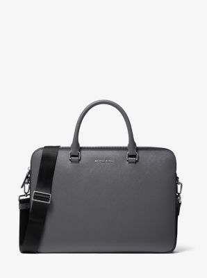 Equal parts sleek and sophisticated the slim harrison briefcase is made from saffiano leather and features smooth top handles and a detachable crossbody strap for versatile carrying options.